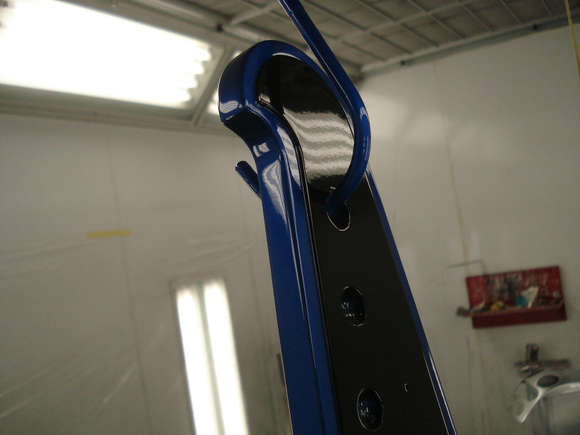 最初に頂いた参考画像でも同じ様な色分けがされていたのですが、それは単に色(ブルーメタリック)の確認だけかと思ってすっかり全部をブルーにしてしまうつもりでした。 が、途中でオーナー様が何か気付いたようで(笑)、「その部分は黒で残して欲しいのですが」と連絡を頂き対応しました。それが無ければ真っ青に仕上げてしまうところでした…。助かりました。有り難い限りです。