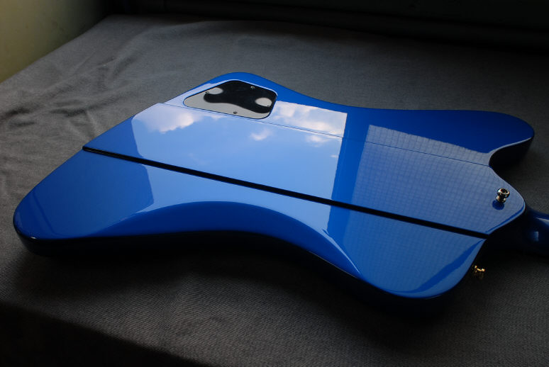 ちょっと上手く撮れていなくてすいません…。 塗装時はブースの天井からS字フックで吊っているのですが、ベース自体が長いのでここを撮る時にはファインダーが覗けませんので…。 まあ塗り分けはこんな感じで良い具合に出来ていると思います。 元々の木目模様は格好よかったのでちょっと勿体無いと思っていましたが、確かに黒とブルメタの2トーンが格好良いんですよね…(憧)。