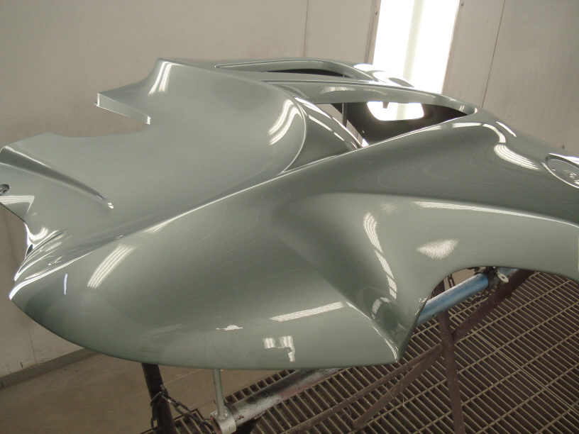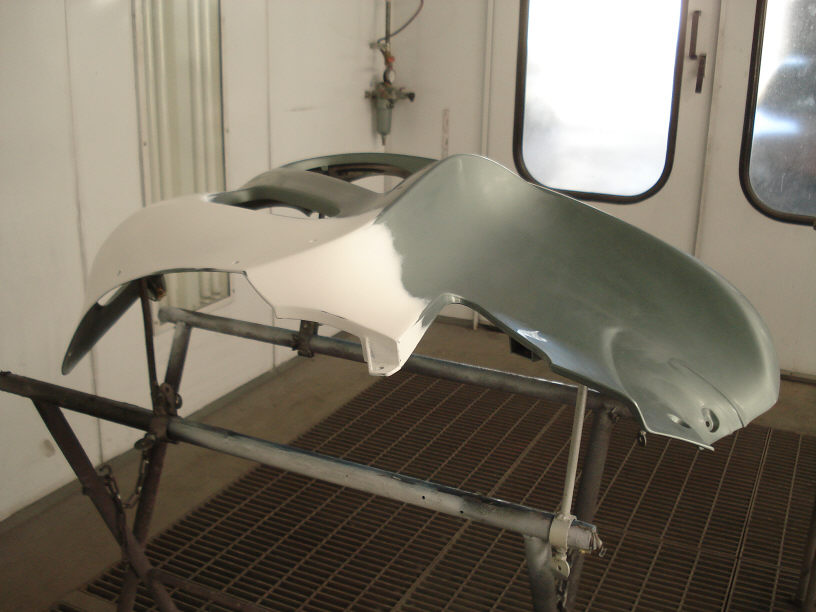 画像左側の丸みを帯びた部分は今回ベースコート(色)は塗っていません。恐らくここがフェーエルリッド部のカウルとツライチになる箇所なので、ここに色を飛ばさないようにすれば隣接パネルとの色違いは起きないですので。勿論クリアーは全面塗ってます。