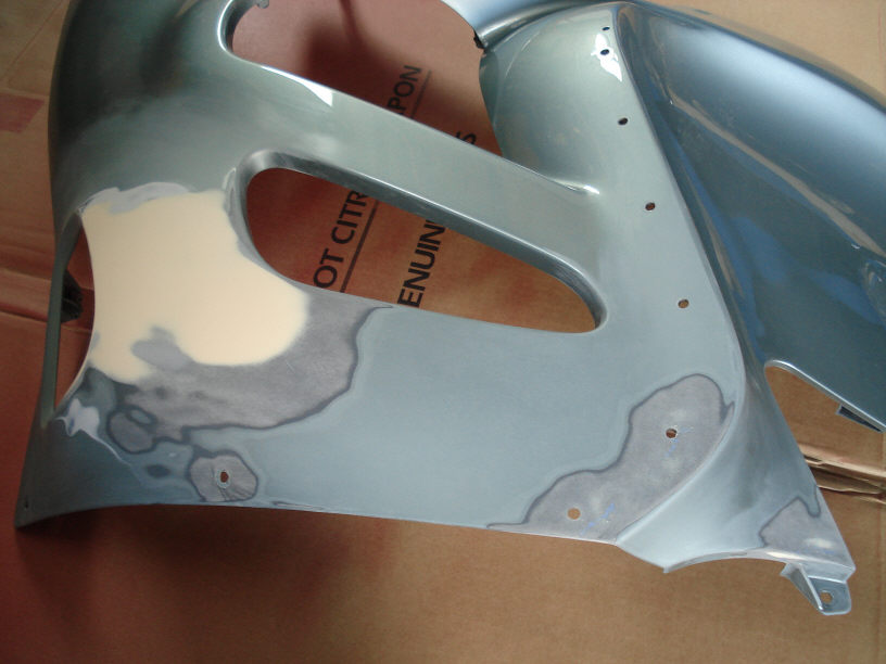 画像は足付け処理が終った状態です。全体的に#1200程度の傷を付け、さらにこれにプラスチック専用プライマーの併用で塗装の密着性を高めます。