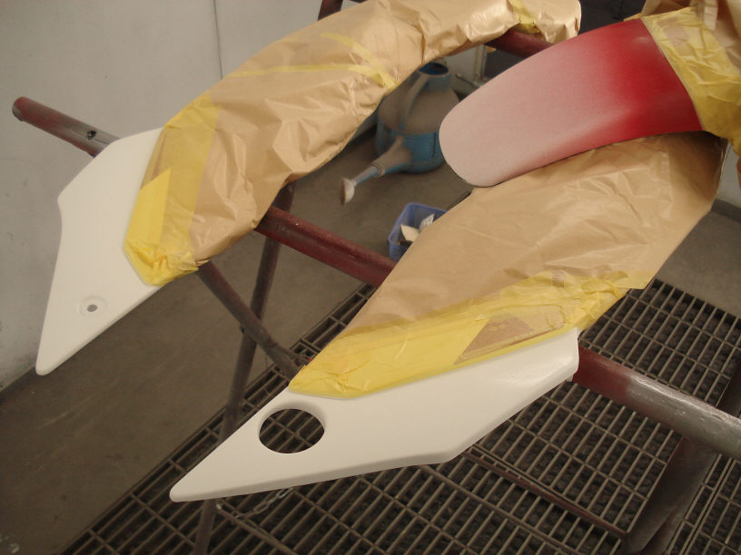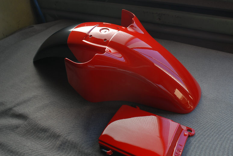 四角いパーツはテールカウルの間に入るカウルです。奥のはフロントフェンダーで、後方は艶消し黒になってます。