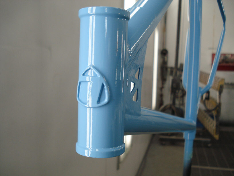 フレームがチタン製だったら、最後にこのエンブレム部分を研摩して素地の金属露出させて光らせると格好良いのですが、鉄(クロモリ)だと錆びてしまうので無理(駄目)ですね…。