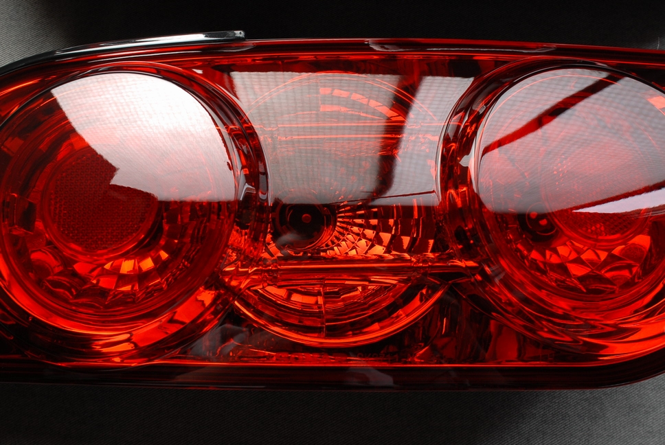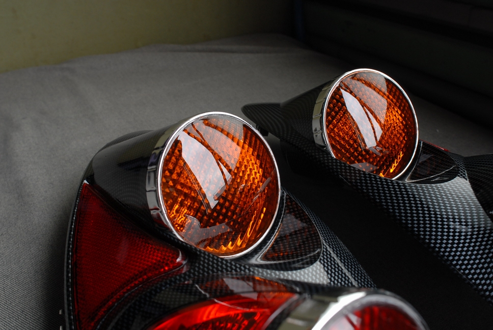 ご依頼頂いたのは奥に移るオレンジ色のレンズの部分で、ここは元々クリアーレンズだったのですが、途中色々あって何故か「メッキ塗装」になってしまっていました。赤い部分も同様に一度はメッキになっています(ただし今回赤いレンズは触れていません)。