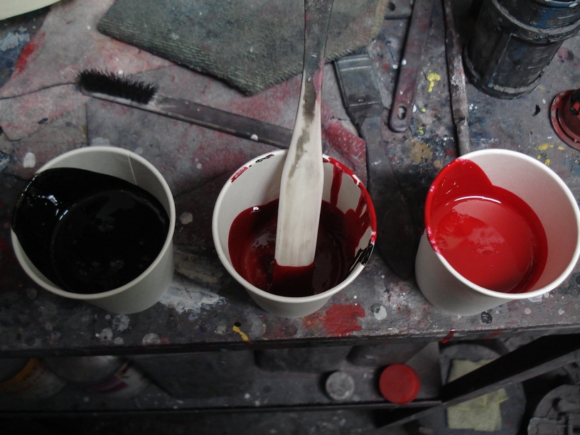 赤はいつもだったらフェラーリのロッソコルサを使うのですが、見本で頂いた画像からしてこちらの赤の方が良いと思って使ってます。 ちょっと前に「三連勝」なる自転車フレームでご依頼頂いた時に選んで頂いたFORDの色ですね。