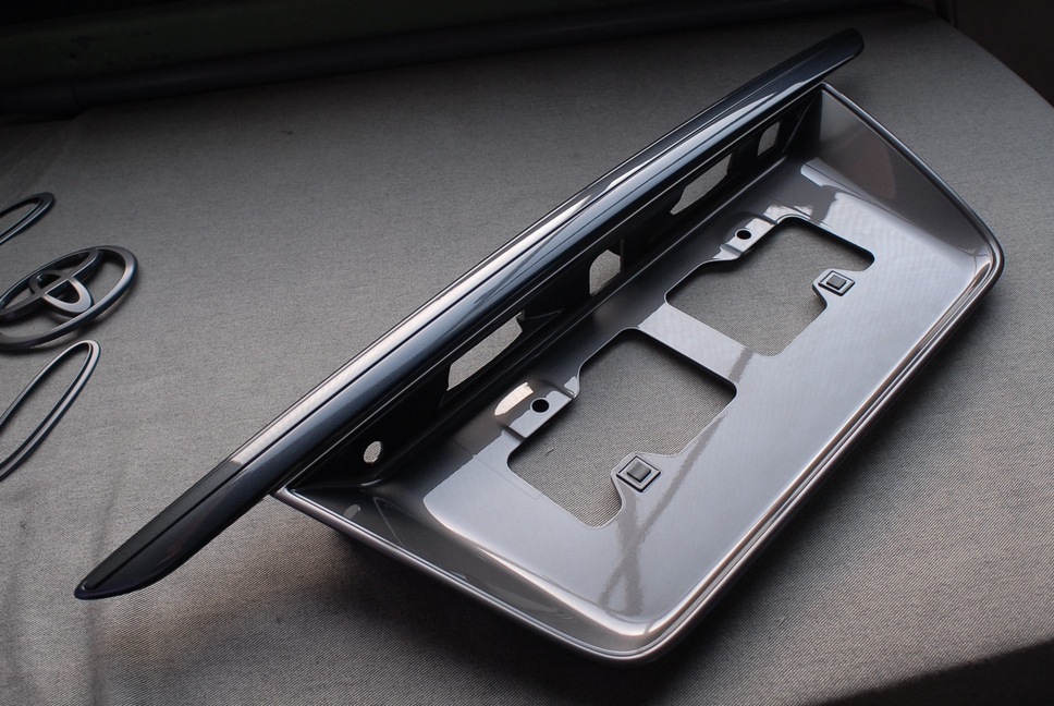 上のナンバーブラケットは艶あり仕上げですが、下のリングとトヨタマークは半艶クリアー仕上げです。