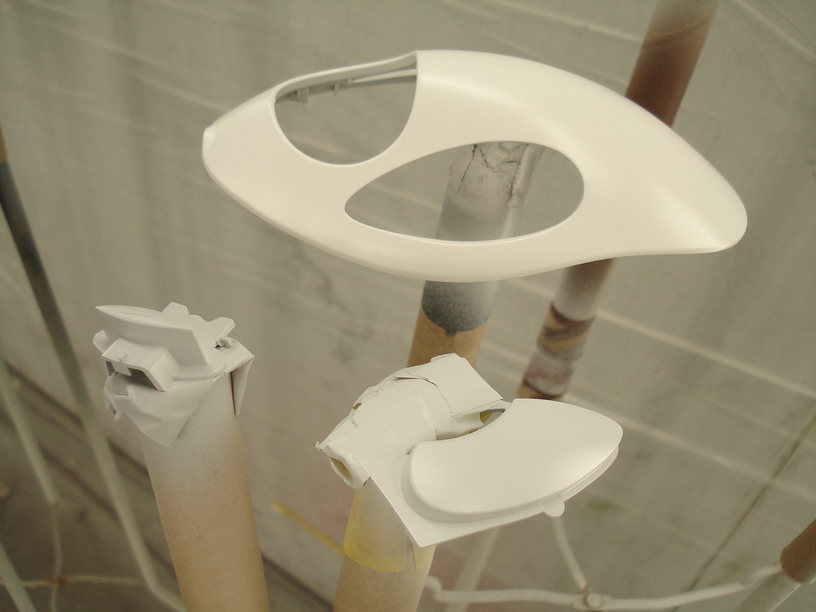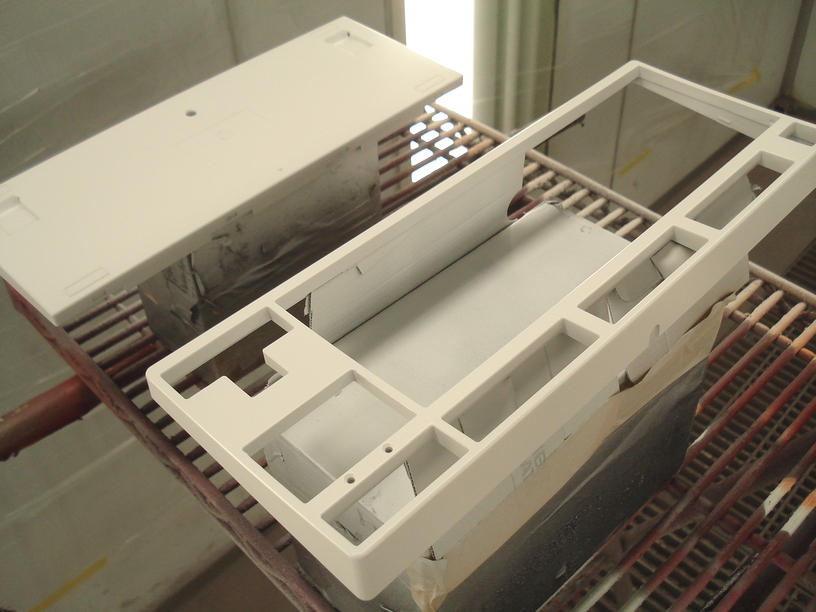 そしてこちらも本塗り準備完了です。色は「原色の白」ですから先程のキーボード&マウスと同じ色ですので一緒に塗っています。 ただしこちらは「艶ありクリアー」ですので、最後はそれぞれ違うクリアーを作って違うガンを用意して塗っています。