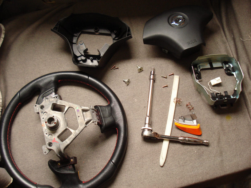 ステアリングスポークカバーは全部で3個付いていて、左右の二個は全部をバラバラにしたら無事外れたのですが下の一つはどう付いているか解りません。 結果、ネジが見えないということは「クリップ」「スライド」「接着」のどれかしかありませんから全てを順番に試してみると、やはりと言うか接着剤で固定されていました。