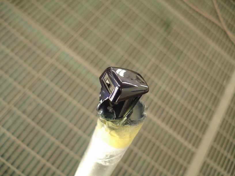 今の車はどうか解りませんが、日産車のウィンドウォッシャーノズルは最初から塗ってあるのが定番です。 なのでウィンドウォッシャーノズル自体を塗るのは初めてでは無いのですが、今回のノズルは今までとちょっと造りが違うみたいですね。 私が知っている物は、ノズルの先っちょは稼働するようになっていて、そこに開いた丸い穴を水を当てたい位置に向けて調整するように出来ています。 なので塗る時はその穴に爪楊枝などを刺して塗っていましたが、今回の(最近の?)ノズルは長方形の穴です。