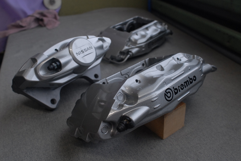 左奥にある「NISSAN」のロゴがある方がリヤ用のキャリパーですね。こちららは色見本としてお預かりしました。