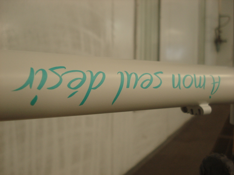ちなみにロゴが上下逆さまなのはフレーム自体が逆さまになっているからです。 本当はあるべき姿の状態で塗りたいのですが、吊るしてだと非常に安定感が無いのでいつも塗装台にシートポスト?を刺した状態で塗っています。 まあ流石にもう慣れましたので(笑)特に問題ではありませんからご安心下さい。