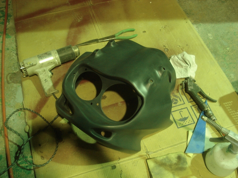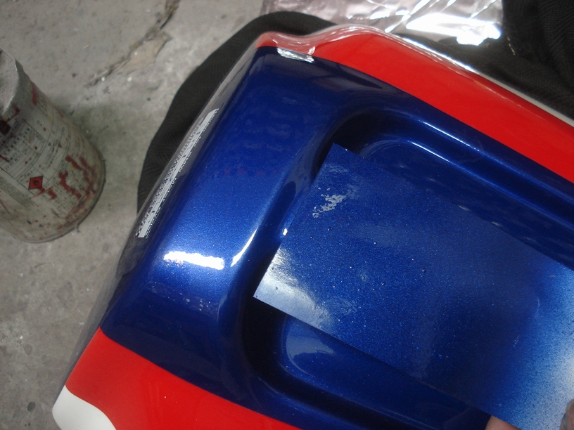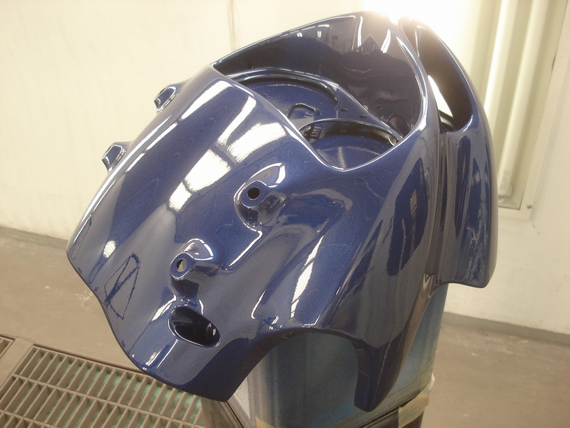 アッパーカウルは社外品か限定物なのでしょうか。素材はFRPです。 ですのでご依頼頂いた時の状態もてっきり「ゲルコート」かと思いましたが実はこれ普通に本塗り仕上げされた物だったんですね。「艶消しグレー」のちゃんとした塗装です。FRP製品なのに下地の状態が悪く無いのは当たり前ですね。