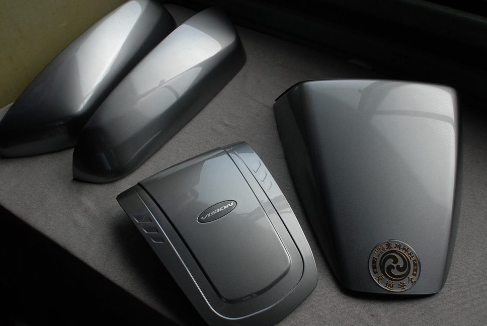 このままだとシリコンオフは揮発してまた元の曇りガラス状態に戻ってしまいますので、これが持続するように裏側にクリアーを塗るのです。勿論使っていて剥がれたりしないように、表同様に下地処理〜プラスチックプライマーの塗布なども行います。