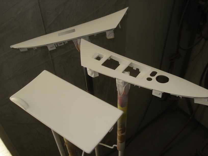 真ん中縦一列の部品は以前もご依頼いただいた方で、画像右にある四角い枠の部品は今回新たにご依頼頂いた方です。これの他にシフトレバー部のパネルもご依頼頂いております。そちらは塗るだけで良いのですが、こちらは梨地なので平滑になるように下地処理が必要です。