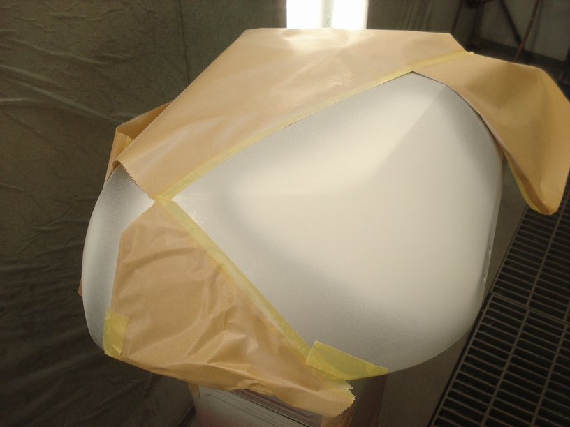サンドブラスト処理を終えてリン酸処理して脱脂洗浄し、マスキングしていよいよ本塗り開始です。