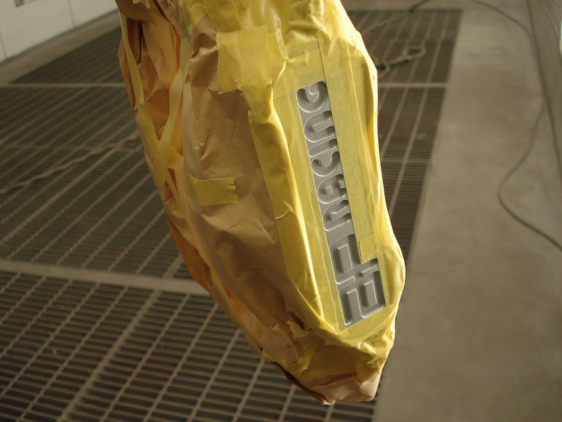 作業方法としては、最初は普通にキャリパー全体を塗ってしまいます。 今回は「キャリパーをシルバーで、ロゴは赤で」と承っていますので、最初にシルバーを塗ってクリアーまで塗って普通通りに仕上げてしまいます。