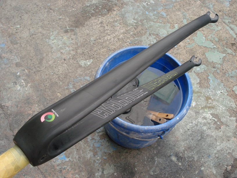 旧塗膜の剥離は溶剤槽に数日間漬けておき、途中に出してはスクレーパーやワイヤーブラシで擦ってまた浸けるのを繰り返すのですが、なんとこのKONAのフレームはたった一日で画像のような状態になりました(驚)。