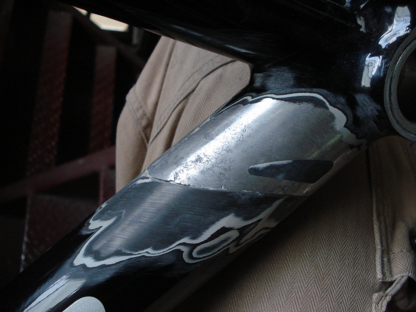 自動車の場合はこういった傷が付き易い部分には予め「アンダーコート」(ボディーシューツ)なる下塗りが施されていて、かなりの肉厚と弾力性のお蔭で鋼板面まで傷が到達し難くなっていたりします。 ただどうしても重くはなるので自転車には向かないかも、ですね。