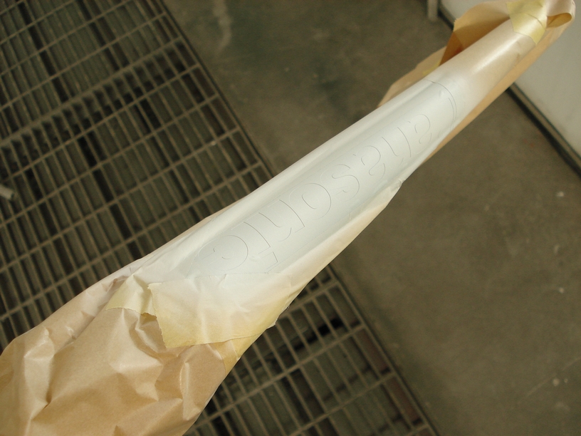 半分のアルミ部分は溶剤槽に漬け置きしておいたので半自動的に旧塗膜は剥離されていて、カーボン部分は手作業(エアーツール)での研磨作業にて旧塗膜を剥離します。