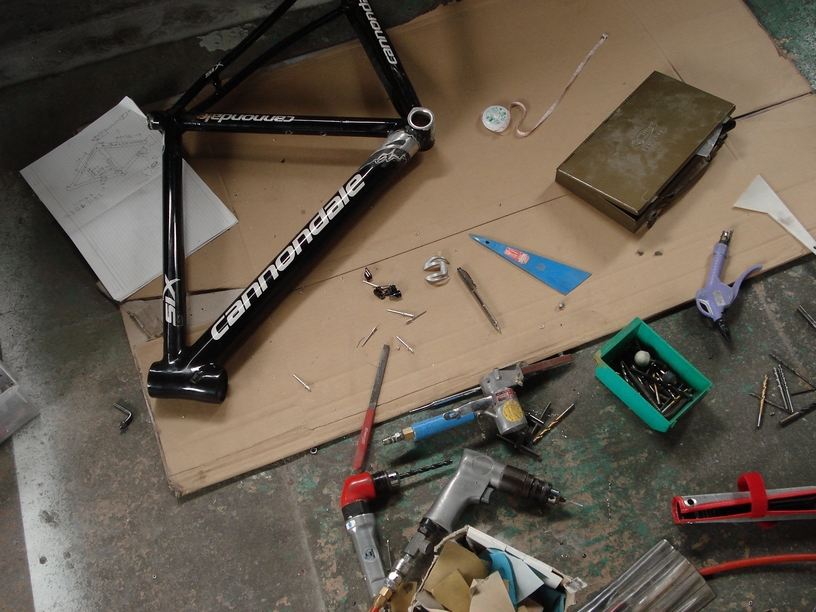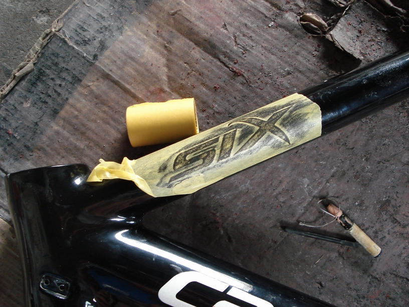 先ほどのKONAのフレームは単色べた塗りなので写真を撮っておくだけで済みましたが、こちらのcannondaleは各ロゴを再現する箇所もあるので、剥離前にそれぞれを記録しておかなければなりません。となるとこれはやはり昔ながらのアナログ作業になる訳ですが(苦笑)。