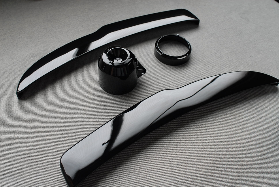見た目は「木材」ですが実際の素材はプラスチックで、それに「水圧転写」なる方法で木目柄をプリントしています。で、その上には塗装と同じウレタンクリアーを塗って仕上げています。