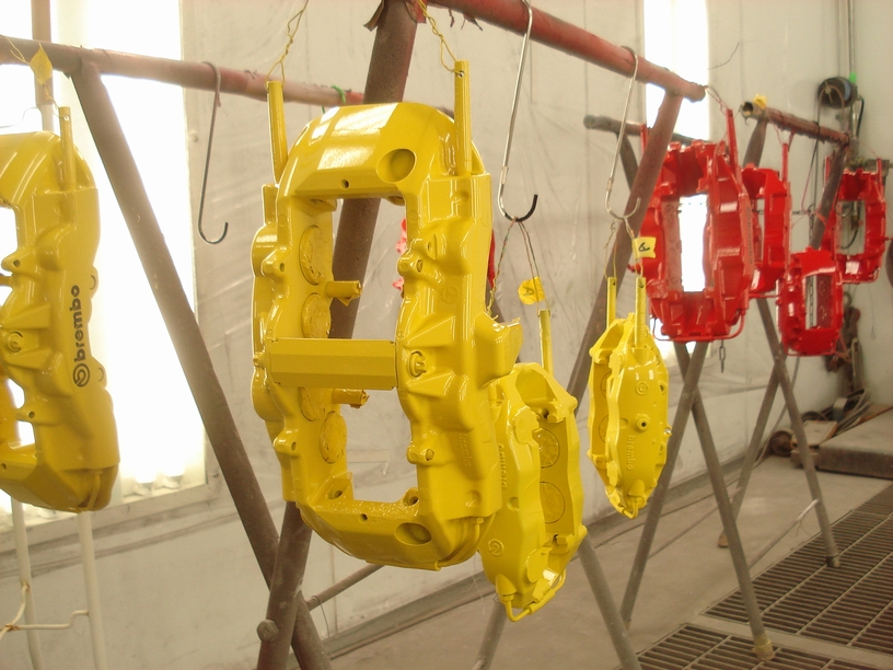 ただ「一日でこんなに塗るんじゃさぞ儲かるんじゃ…」はちょっとした勘違いでして(苦笑)、手前のイエローのキャリパーはいつものブレーキ屋さんからの依頼ですから私が頂くお金は微々たるもので(苦)、奥の赤いキャリパーは私のお客さん(業者さん)からのご依頼品ですが、こちらもサンドブラスト処理(旧塗膜剥離)から清掃・マスキングまでの一番大変な作業はブレーキ屋さんにお願いしていていますから当然費用(外注費)は発生しています。 キャリパー4個の下地処理分での私の儲けは¥8,000だけですからとてもボッたくれる余地はありません(苦)。