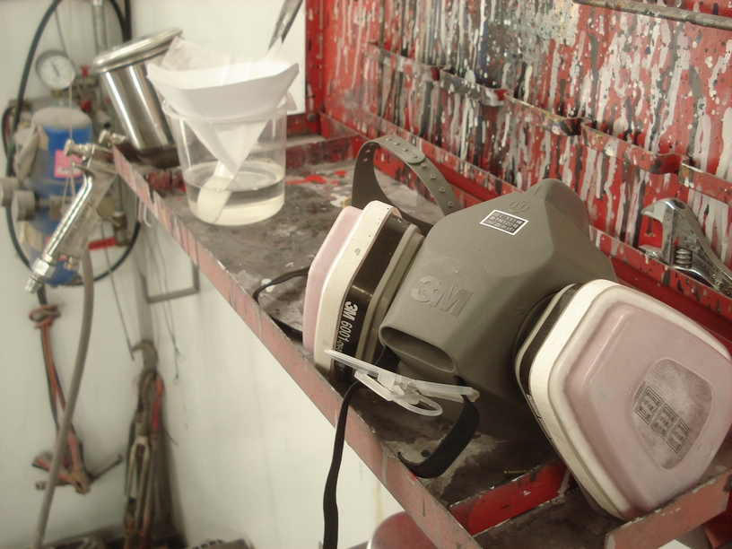 塗装で頂く料金には塗料材料や副資材だけでは無く、こういった直接御依頼には関わらない物の費用も含まれていたりします。画像に写るのは本塗り時に使う「防毒マスク」ですね。