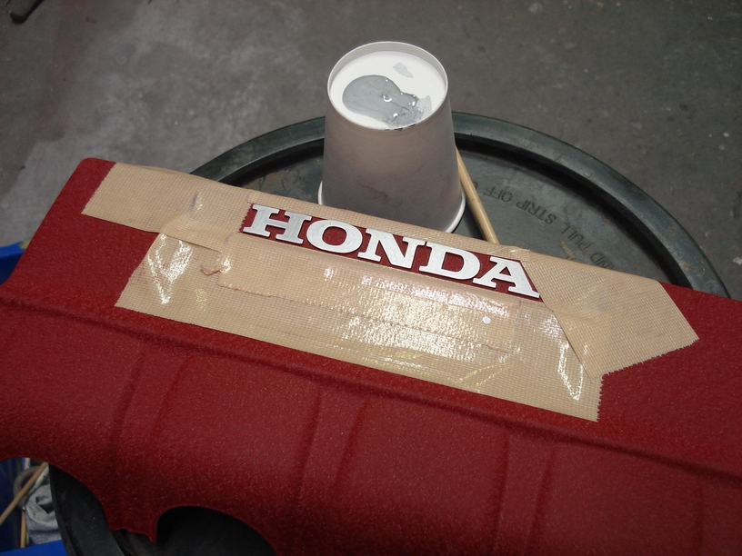 ちょっと解りにくいかも知れませんが、ロゴのマスキングシールを貼っている箇所にはロゴカラーとなる「白」を塗ってあります。比較的アバウトですがこの時点ではロゴの位置にさえ色が塗られていればOKです。ただむやみやたらに飛ばすとそのミストが艶引けや密着力低下の原因になるのでやはり丁寧には心掛けます。また当然素手で触れる機会は少なくし、手洗いは作業中何度も遂行します。