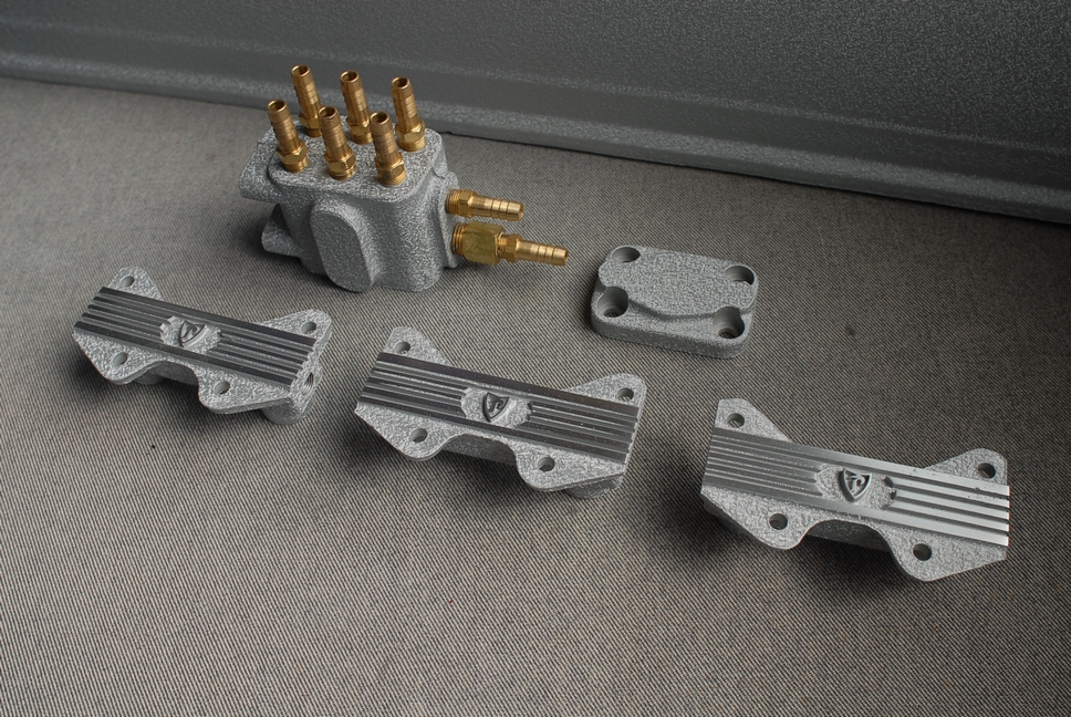 色は「グレーシルバー」で、フェラーリのサージタンクなどに塗っている色と同じですね。 ただこの色単体だと「ちょっと地味すぎるのでは…」と思いますが、当時の純正色?がこのような感じらしくこれでOKとの事でした。画面右奥に写っている赤い結晶塗装の製品は私の私物で(笑)ジュラルミン製の文鎮です。色の確認と言う事で一緒に並べてみました。