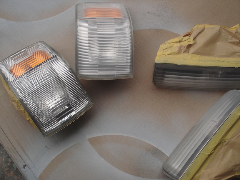 画面左側にあるのがキャラバンのコーナーレンズで、右側にあるのがクラウンマジェスタのフラッシャーランプです。 前者は新品部品で後者は中古品ですがこちらは新品での入手が不可能との事と伺っています。確かに飛び石傷が多いのでそれの処理が必要のようです。