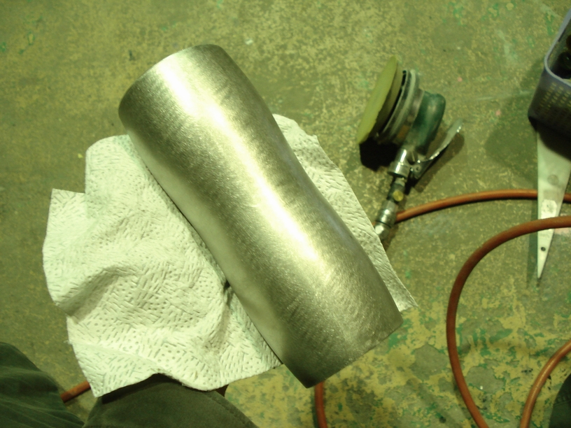 画像はステンレス表面のダブルアクションサンダー#180で全体に万遍なく傷を付けている所です。この後のプライマーが食いつく為の足付処理ですね。