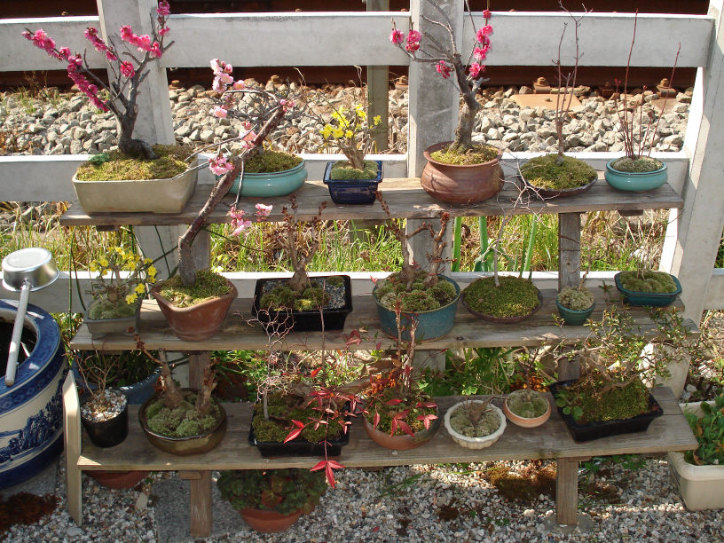 まだ現場は寒くて辛い日々が続くのですが、手持ちの盆栽たちは何だか華やかになってきました。梅と黄梅が満開です。