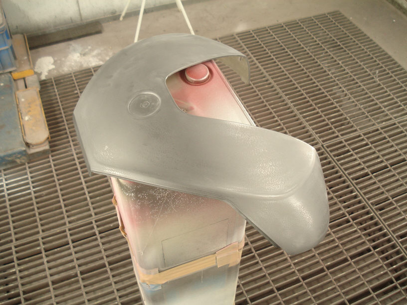 そして下塗り完了です。色はソリッドカラーならば何でも可能ですので、今回御依頼頂いている「シルバー」が隠ぺいし易い淡いグレー色にしておきました。