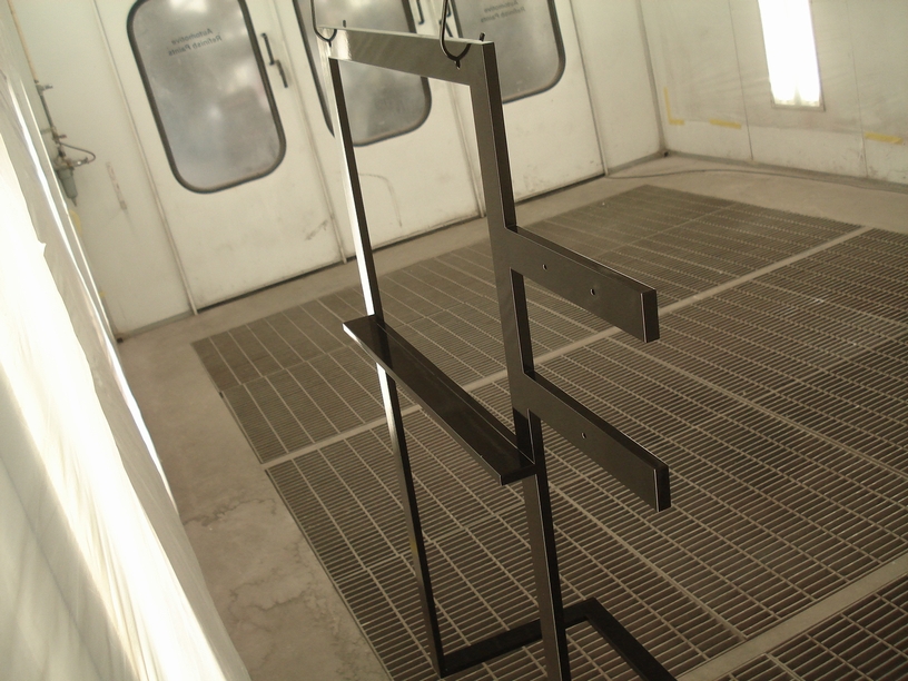 で、塗装する為にブース内に設置する訳ですが、このテレビ台は見た目以上に相当重く、ブースの天井に固定されているアンカーに吊るすのも結構大変でした。見た目はスマートなんですけどね。もって見ると「鉄の塊」といった感じです(苦)。
