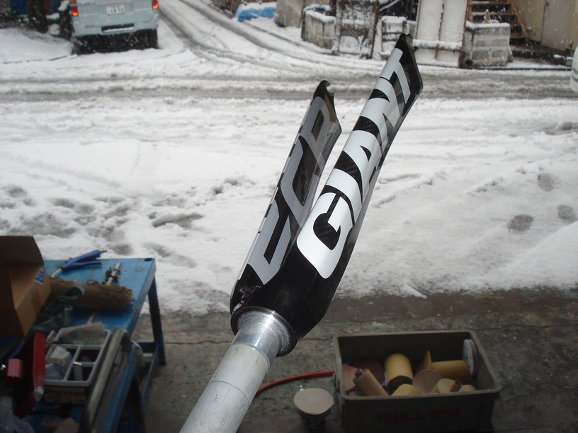 ちなみに今回のフォークですが、旧塗膜を剥がしたくてこの作業をしている訳では無く、大きく入ったロゴ「FCR」と「GIANT」のロゴ部分の凸凹を平滑にしたかっただけです。