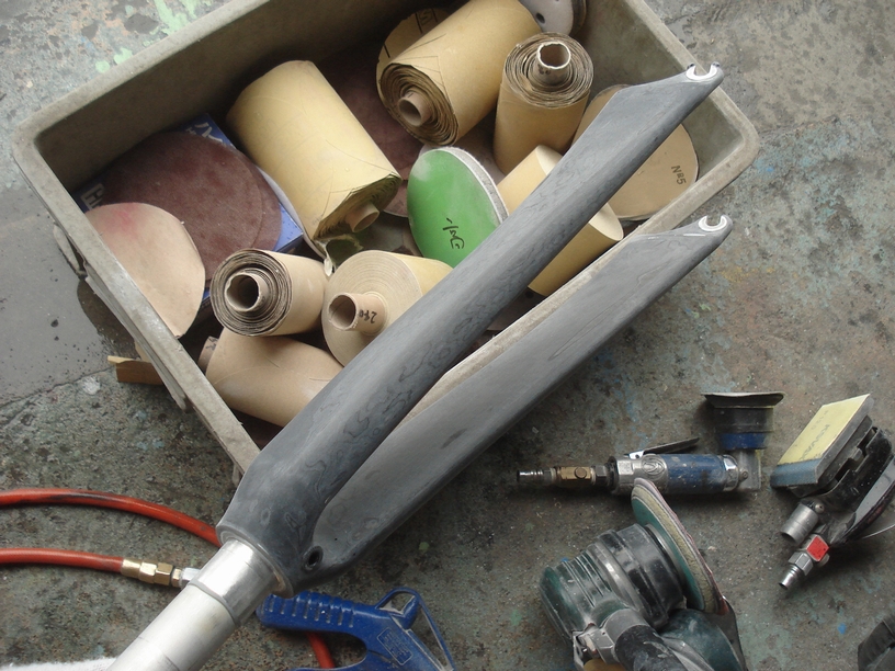 で、こちらのフォークはカーボン製ですので溶剤漬け置きは出来ませんから別工程での作業となります。ダブルアクションサンダー掛けですね。
