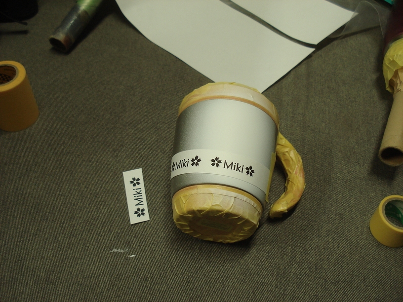 画像では貼ってある紙が斜めに歪んでいますがこれは被塗物(マグカップ)がテーパー状になっているからで、紙を長いまま使っているから酷く見えますね。実際の作業では長さが短いですし修正しながら貼りますのでこんな風にはなりませんからご安心下さい。
