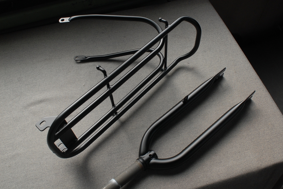 考えて見ればフレームもフォークもキャリアも全部裏返して塗っていますね。本来ならば正姿勢の状態で塗るのが基本なのですが、小物塗装の場合はそうも言ってられませんからね。