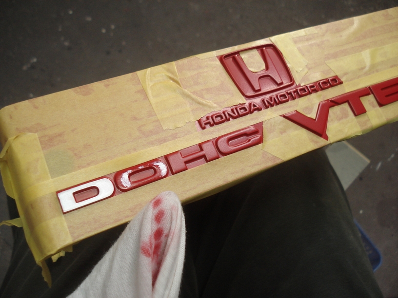 ベースコートの赤が完全に乾いたら、いつもの結晶塗装済みヘッドカバーのように凸部分を残して周りをマスキングします。