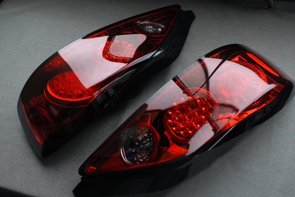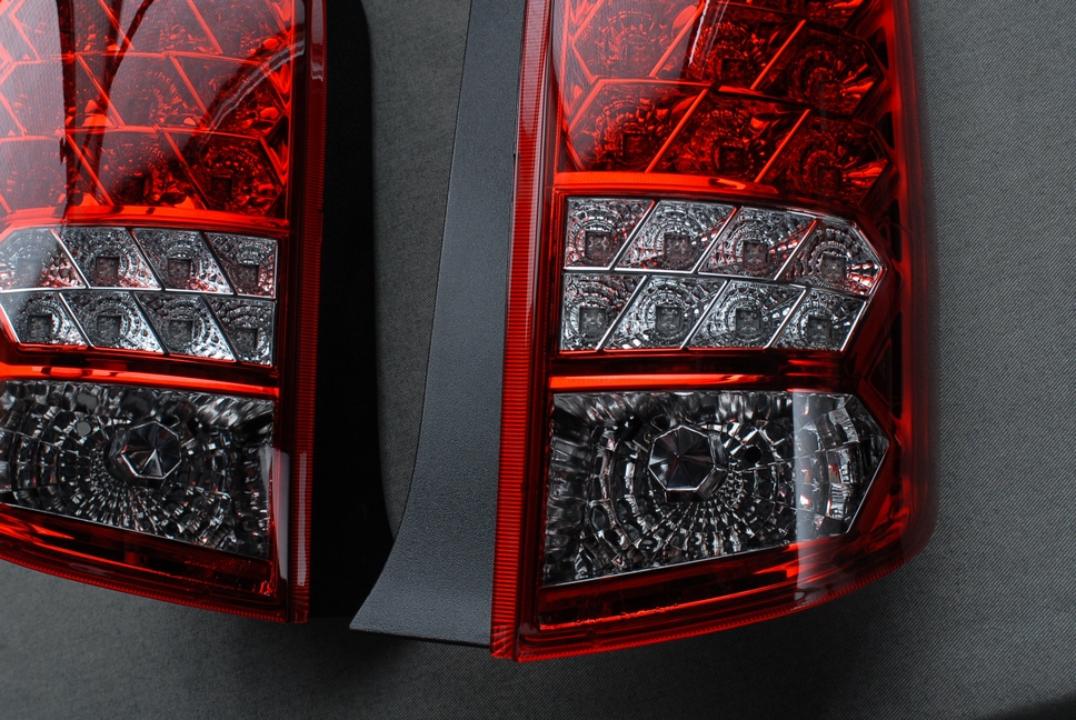 こちらは新品ですがやはり全面クリアーだった物をレッドキャンディー塗装で純正風に仕上げています。ウィンカーとバックランプ部分は赤くしない「クリアー抜き」で対応しています。この角度からだとっちょっとズレて見えますが正面を向くと内部反射板の枠に合っていますのでご安心下さい。
