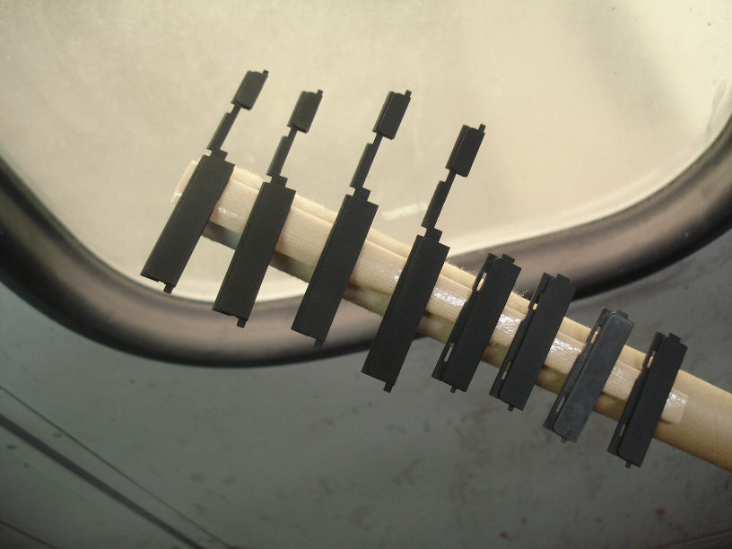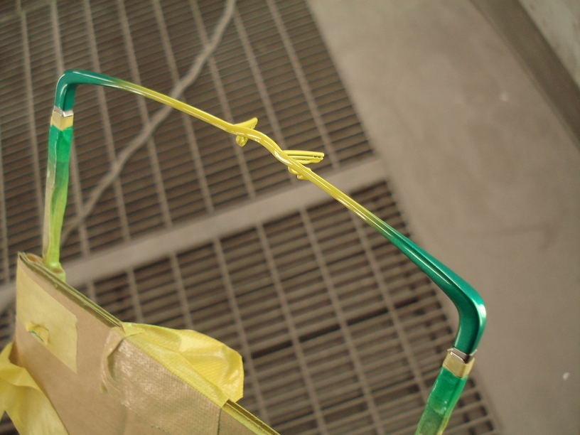 その後良く脱脂清掃してマスキングをし、本塗りのタイミングを待ちます。現在工場二階奥の天井に吊るしてあります。