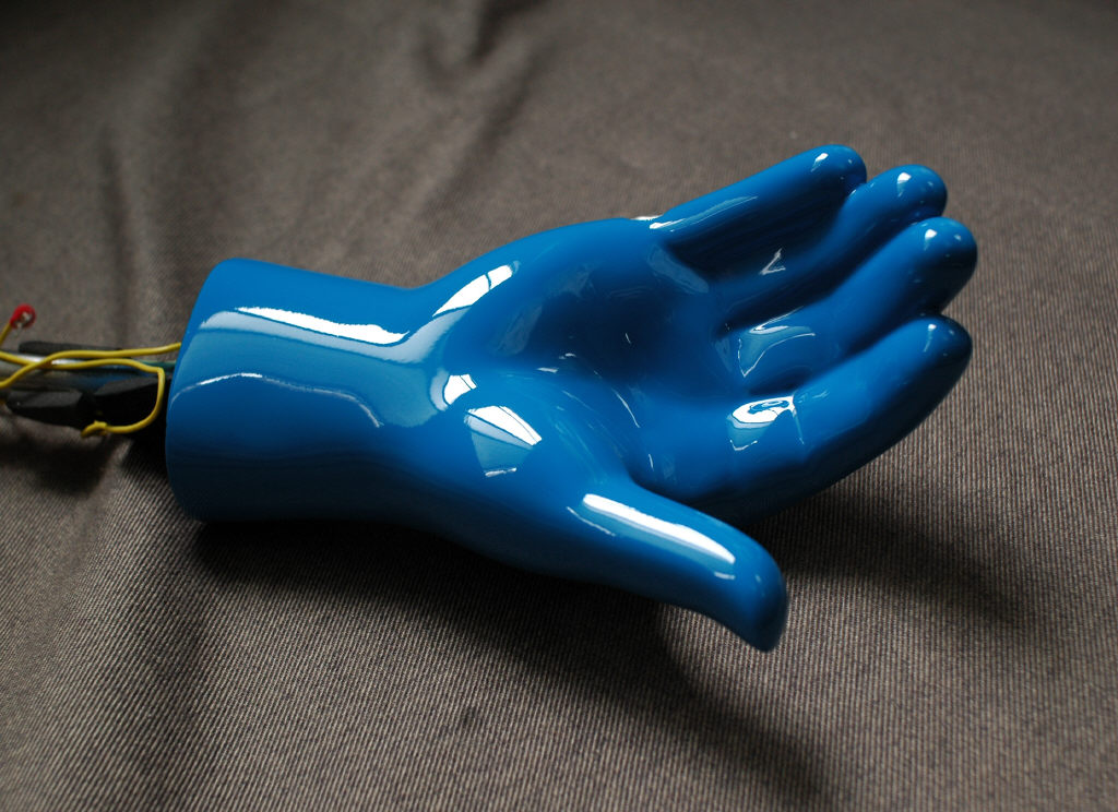 ちなみに画像の手は私が趣味で造ったものではなく、以前仕事としてご依頼頂いた案件です。博物館だかの施設に展示されている物で、実際に触れて試せる設備品らしく私のところに来た時は塗膜が擦り切れてボロボロでした。働き者の手としては賞賛したいくらいでしたから敬意をもってピカピカに仕上げさせて頂きました。青って言うのが凄いですが(笑)。