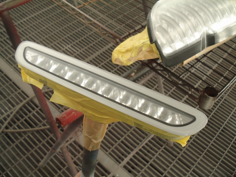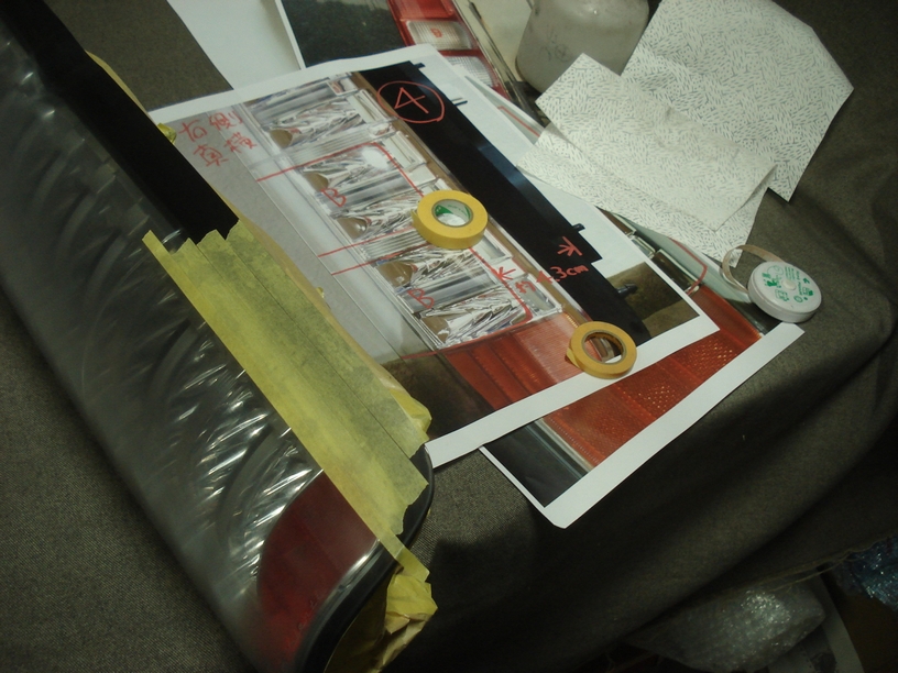 インプレッサのテールランプのように何十個も作業していれば比較的早く手が動くのですが、初めての案件でこういった位置の指定がある場合には恐ろしく時間が掛かります。失敗したからといって塗り直しは出来ませんからね。しかも足付け処理まで終わっていますから安易にベタベタと触ったり出来ませんし(油も皮脂も汗も避けなければならないのです)。