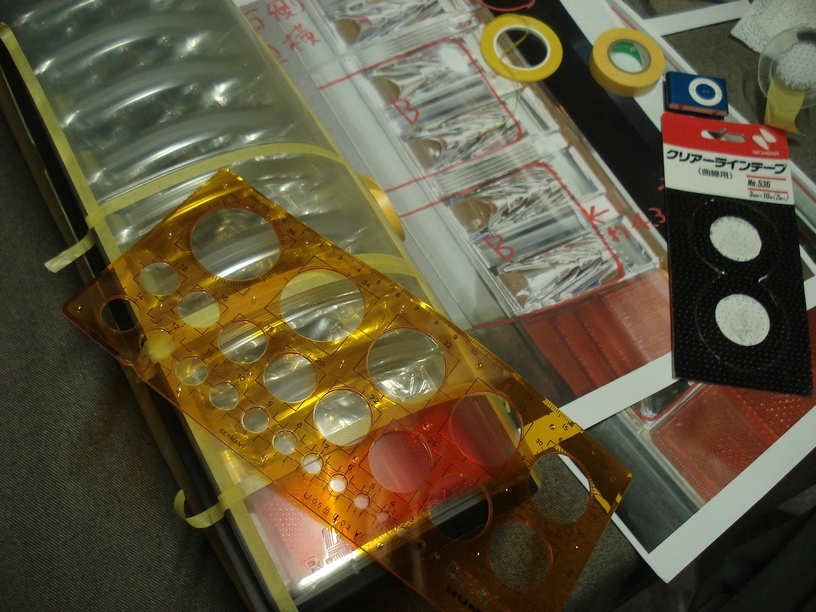 で、この角のアールも色々ありますから、目安としてそういった定規を使います。と言うか以前これがあったのを思い出して今回引っ張り出してきました(笑)。ユザワヤで買ったかSATAのエアーブラシセットに入っていたかどちらかなのですが、それぞれの○にサイズが記載してあるので凄く便利です。