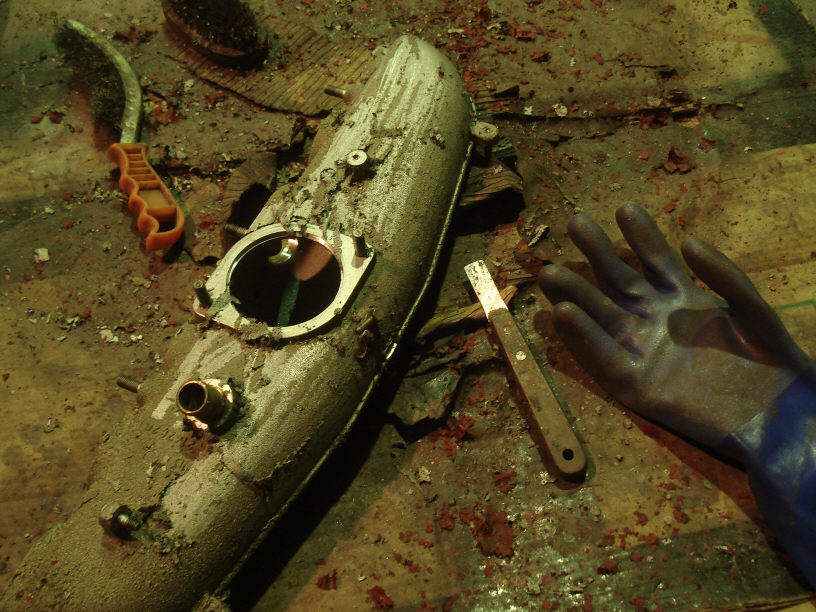 数日間溶剤槽の中に浸け置きしておき、塗膜が柔らかくなったところでスクレーパーやワイヤーブラシなどで塗膜を削り落とします。 既に剥がれかかっているところはビローンと簡単に取れるのですが、しつこい所は簡単に取れてくれませんからまた溶剤の中に戻します。