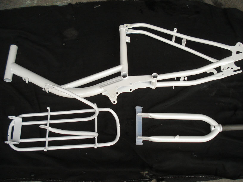 画像には写っていませんが、リヤタイヤが付く部分にはネジ2本で固定されているフレームの一部(なんて言うんですかね?)も別に塗っておりますのでご安心下さい。 その他付属品はプレート以外は取り付けないで返却しますね(位置を間違えて塗装に傷を付けるのはマズイですので…)。