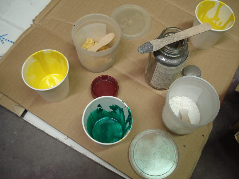 色の作成となると通常は作業現場でとなりますが、現在の私(プロフィット)の状況としては「知人工場内に間借り」といった形態ですから、どうしても面積を取ってしまう「塗料」は自宅に置いてあったりします。