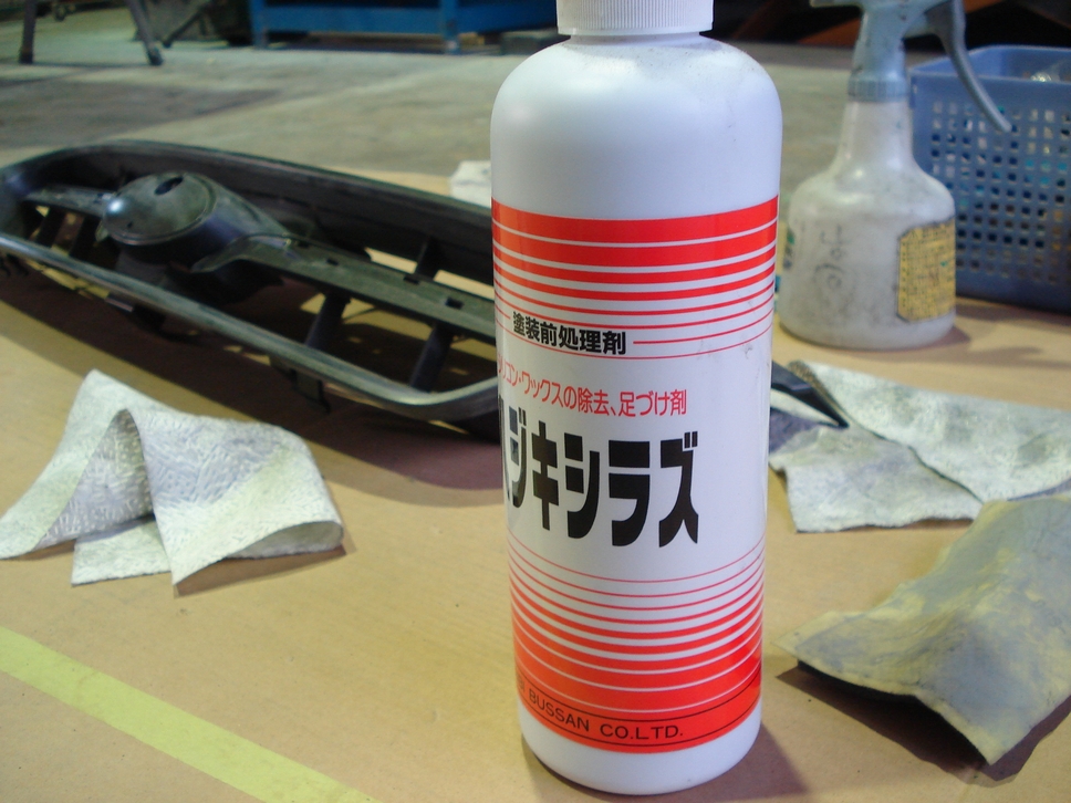 これは所謂「ウォッシュコンパウンド」なる製品で、洗剤と研磨剤粒子が混ざって入っています。 これをスコッチ(繊維状の研磨材)に付けて塗膜表面を研磨します。 足付処理と脱脂洗浄〜清掃までが出来る優れ物ですが、そういった特性故に冬場に使うと手荒れが酷くなります…。