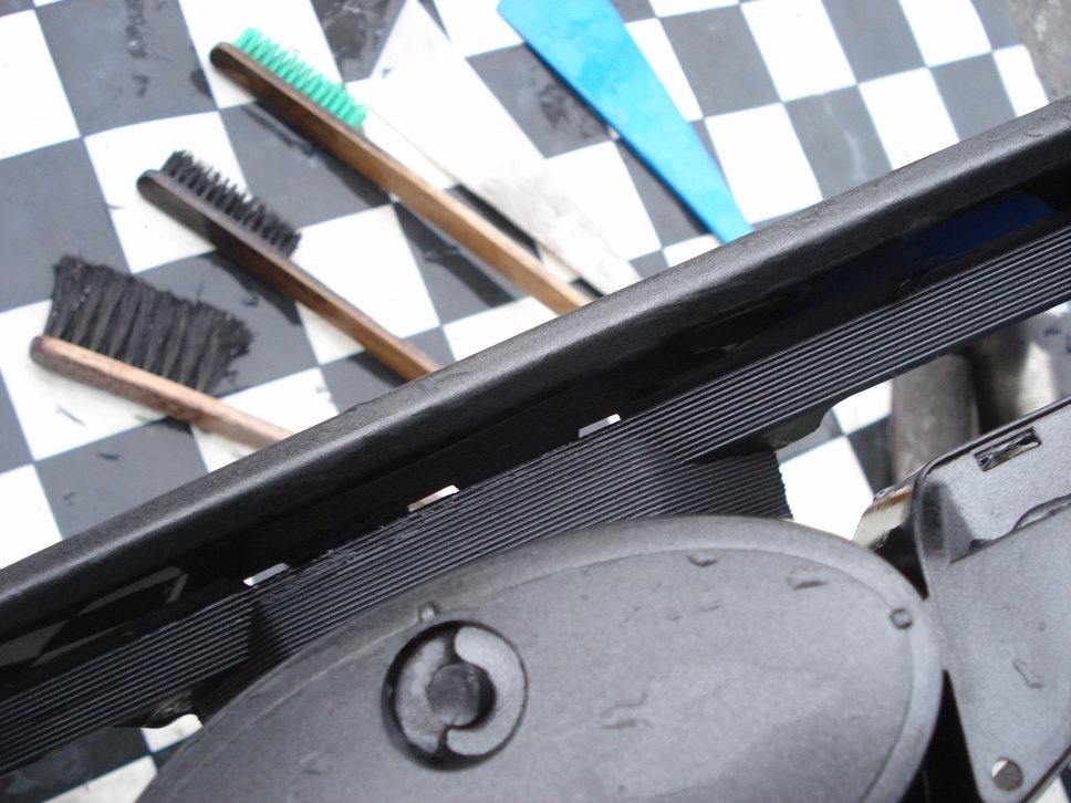 こういった模様状の細かい箇所にはさすがにスコッチも当たり難いので、そういった場合にはコシの強いナイロンブラシ(緑色のブラシ)に先ほどのハジキシラズを塗ってガシガシと擦ります。