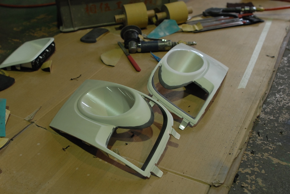 逆に全体に飛び石傷が多数あったりする場合は、それの処理として「研磨→全面にサフェーサー塗布→完全硬化→研磨」といった作業が必要になるのでどうしても費用が高くなってしまいます。 なのでそういった場合は程度の良い中古品を新たに用意した方がトータル費用は安く済む場合は結構多いです。 この歪な形の部品をサフェーサー塗って研ぐとなると相当大変ですので…。