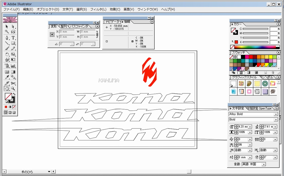 先日の「K」のロゴに引き続き、今度は「KONA」のロゴと「KAHUNA」のロゴを作成します(しまいた)。